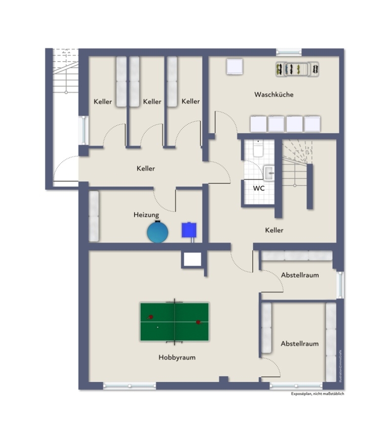 Das Haus ist vollunterkellert, jeder Wohneinheit ist ein Kellerabteil zugeordnet. Neben dem Heizungsraum, einer Waschküche befindet sich ein großer Hobbyraum im Kellergeschoss.