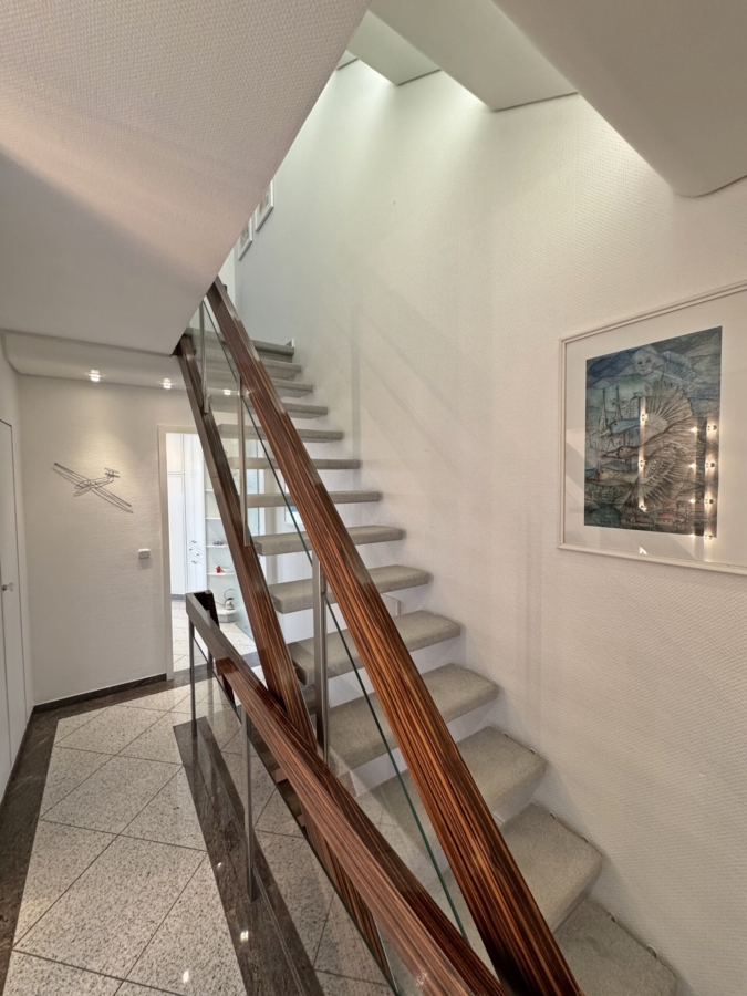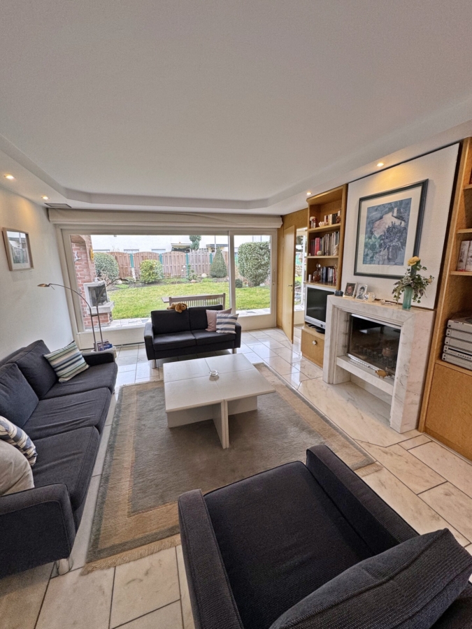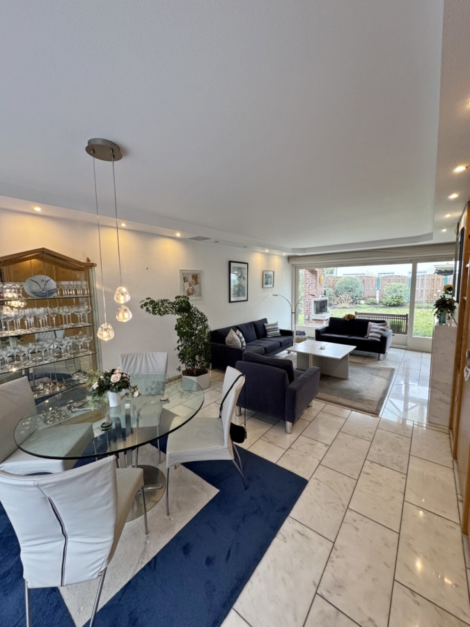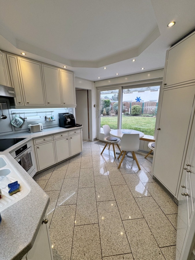 Sie betreten das Haus und befinden sich im hell gestalteten Eingangsbereich mit einem separaten Gäste WC sowie einer praktischen Abstellkammer. Von hier aus betreten Sie die helle Küche, welche mit einer gepflegten und voll ausgestatteten Einbauküche bestückt ist. Nebenan befindet sich das Wohn- und Esszimmer, das Herzstück des Hauses. Knapp 32 m² bieten Ihnen die Möglichkeit, diesen Raum zu ihrem ganz persönlichen Familientreffpunkt zu gestalten. Durch die große Fensterfront ist dieser Raum nicht nur lichtdurchflutet, sondern bietet Ihnen gleichzeitig einen tollen Ausblick in den gepflegten Garten in West-Ausrichtung. Die überdachte Terrasse mit kleinem Teich und einem Grill-Kamin sowie den Garten, erreichen Sie sowohl über die Küche als auch über das Wohnzimmer.