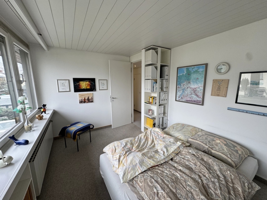 Im 1. Obergeschoss befindet sich das Badezimmer sowie drei Schlafzimmer, davon ein Elternschlafzimmer, ein Kinderzimmer sowie ein Arbeits- oder Gästezimmer. Das geflieste Tageslicht-Badezimmer ist mit einem großen Doppelwaschtisch mit Spiegelschrank, einem WC, einem Bidet und sowohl mit einer Eck-Badewanne als auch mit einer Dusche ausgestattet.