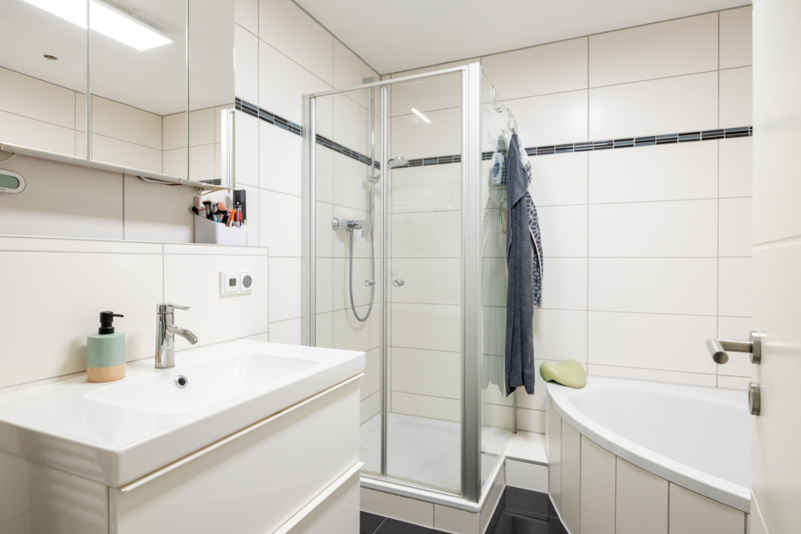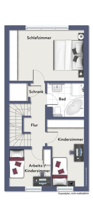 Im Obergeschoss befinden sich die drei Schlafzimmer des Hauses. Das kleinste der drei Zimmer eignet sich mit seinen 7,30 m² optimal als Arbeits- oder Kinderzimmer. Ein weiteres Kinderzimmer mit einer Größe von knapp 11 m² befindet sich direkt nebenan und das Elternschlafzimmer bietet Ihnen auf ca. 18 m² Platz zur Erholung vom Familienalltag. Das Badezimmer ist hell und modern gefliest und sowohl mit einer Dusche als auch mit einer komfortablen Eck-Badewanne ausgestattet.
