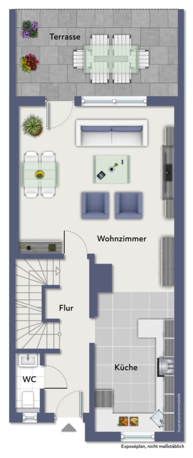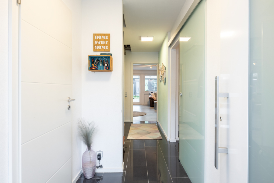 Im Erdgeschoss des Hauses befindet sich der Eingangsbereich mit separatem Gäste WC, der großzügige und lichtdurchflutete Wohn- und Essbereich (ca. 28 m²) sowie die Küche mit einer modern ausgestatteten Küchenzeile. Über das Wohnzimmer gelangen Sie auf die ca. 16 m² große überdachte Terrasse und in den gepflegten und Garten inklusive Gartenhäuschen in West-Ausrichtung.