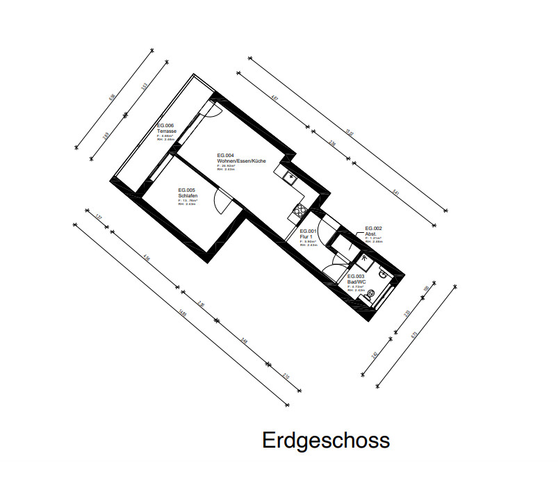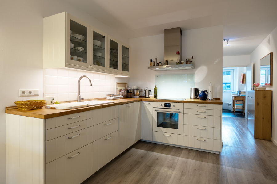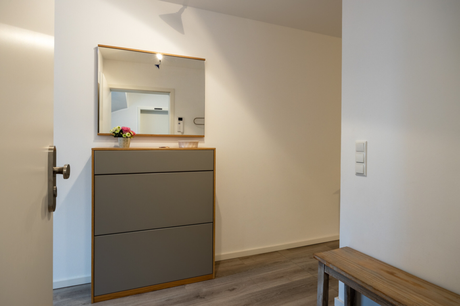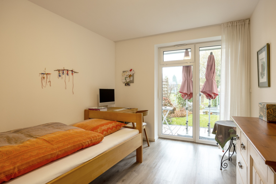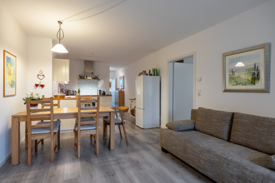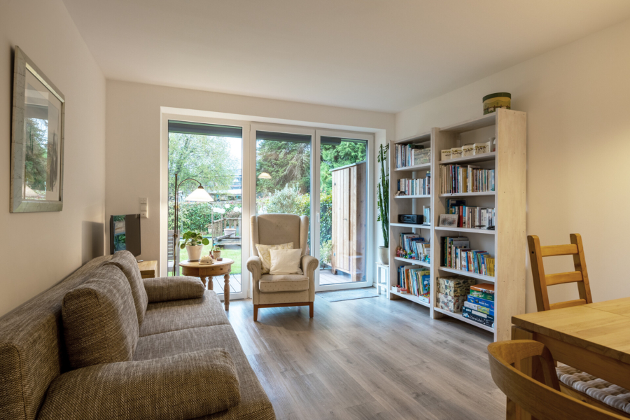 Circa 54 m² Wohnfläche verteilen sich auf den Eingangsbereich und den Flur (5,90 m²), das Wohn– und Esszimmer mit offener und voll ausgestatteter Einbauküche (24,92 m²) und Zugang zur Terrasse (2,33 m²) und in den Garten, ein Schlafzimmer (13,77 m²) und ein helles Badezimmer mit Fenster und ebenerdiger Dusche (4,72 m²). Für mehr Stauraum in der Wohnung sorgt die 1,21 m² große Abstellkammer im Flur.