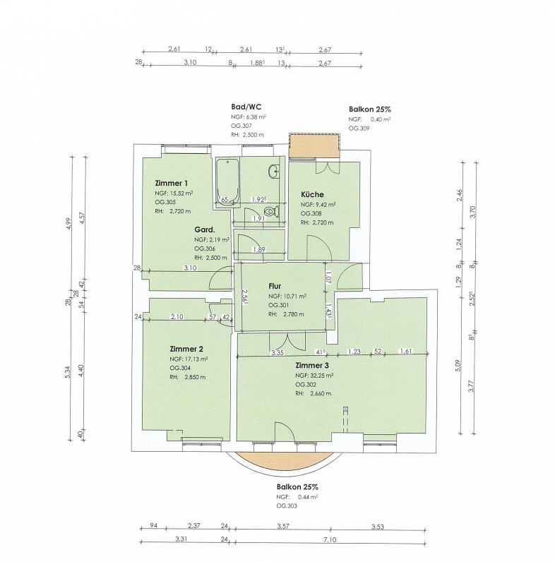 Circa 95 m² Wohnfläche verteilen sich auf einen Flur (10,71 m²) von welchem alle Zimmer der Wohnung zu erreichen sind, eine separate Garderobe (2,19 m²), ein geräumiges Wohnzimmer mit offener Küche (32,25 m²) und Süd-Ost-Balkon (0,44 m²), ein Schlafzimmer (17,13 m²), ein Arbeits– oder Kinderzimmer (15,52 m²), ein Fensterbad (6,38 m²) und eine separate Küche (9,42 m²) ebenfalls mit Balkon in Nord-West-Ausrichtung (0,40 m²).