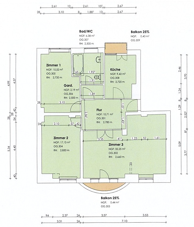 Circa 95 m² Wohnfläche verteilen sich auf einen Flur (10,71 m²) von welchem alle Zimmer der Wohnung zu erreichen sind, eine separate Garderobe (2,19 m²), ein geräumiges Wohnzimmer mit offener Küche (32,25 m²) und Süd-Ost-Balkon (0,44 m²), ein Schlafzimmer (17,13 m²), ein Arbeits– oder Kinderzimmer (15,52 m²), ein Fensterbad (6,38 m²) und eine separate Küche (9,42 m²) ebenfalls mit Balkon in Nord-West-Ausrichtung (0,40 m²).