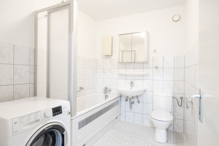 °innenliegendes Wannenbad mit Waschmaschinenstellplatz, hell gefliest