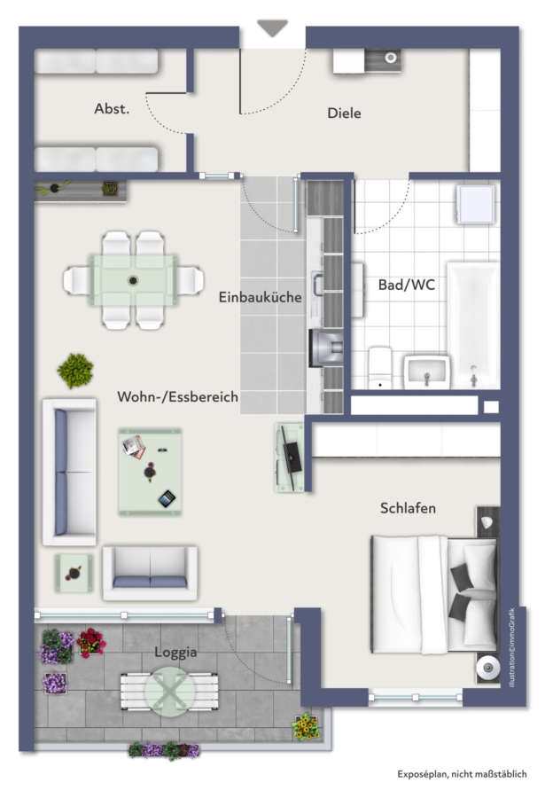 Die Wohnfläche von ca. 48 m² ist optimal aufgeteilt. Das Herzstück der Wohnung bildet der großzügige Wohn-/Ess– und Schlafbereich mit offener Küche und Zugang zur Süd-Loggia.
