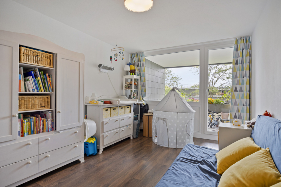 Die Wohnung befindet sich im 4. Obergeschoss eines 1982 erbauten Hauses im ehemaligen Gerling-Wohnpark in Köln Niehl und wurde 2021 kernsaniert.