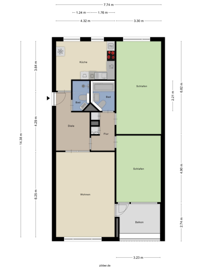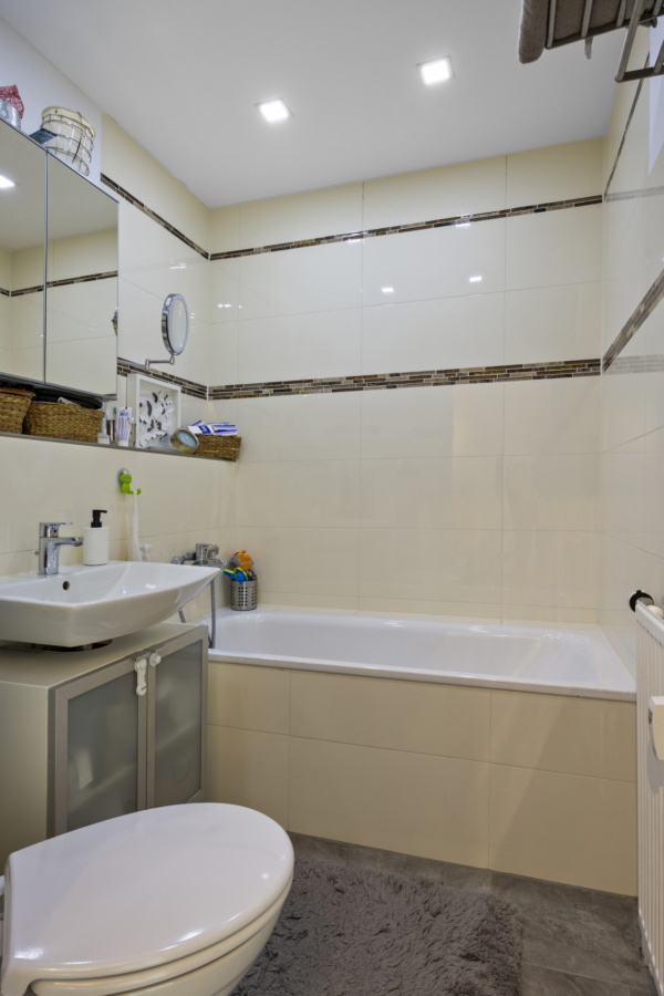 Die knapp 102 m² Wohnfläche verteilen sich wie folgt: Küche (13 m²), Wohnzimmer (27 m²), Süd-Balkon (8,60 m² = 4,20 m²), Schlafzimmer (22,50 m²), Wannenbad (3,70 m²), Kinderzimmer (16 m²), Duschbad (2,60 m²) sowie Diele (8,60 m²) und Flur (4,49 m²).